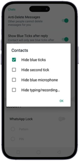 Hidden Read Receipts: Hide blue ticks and second ticks for increased privacy.